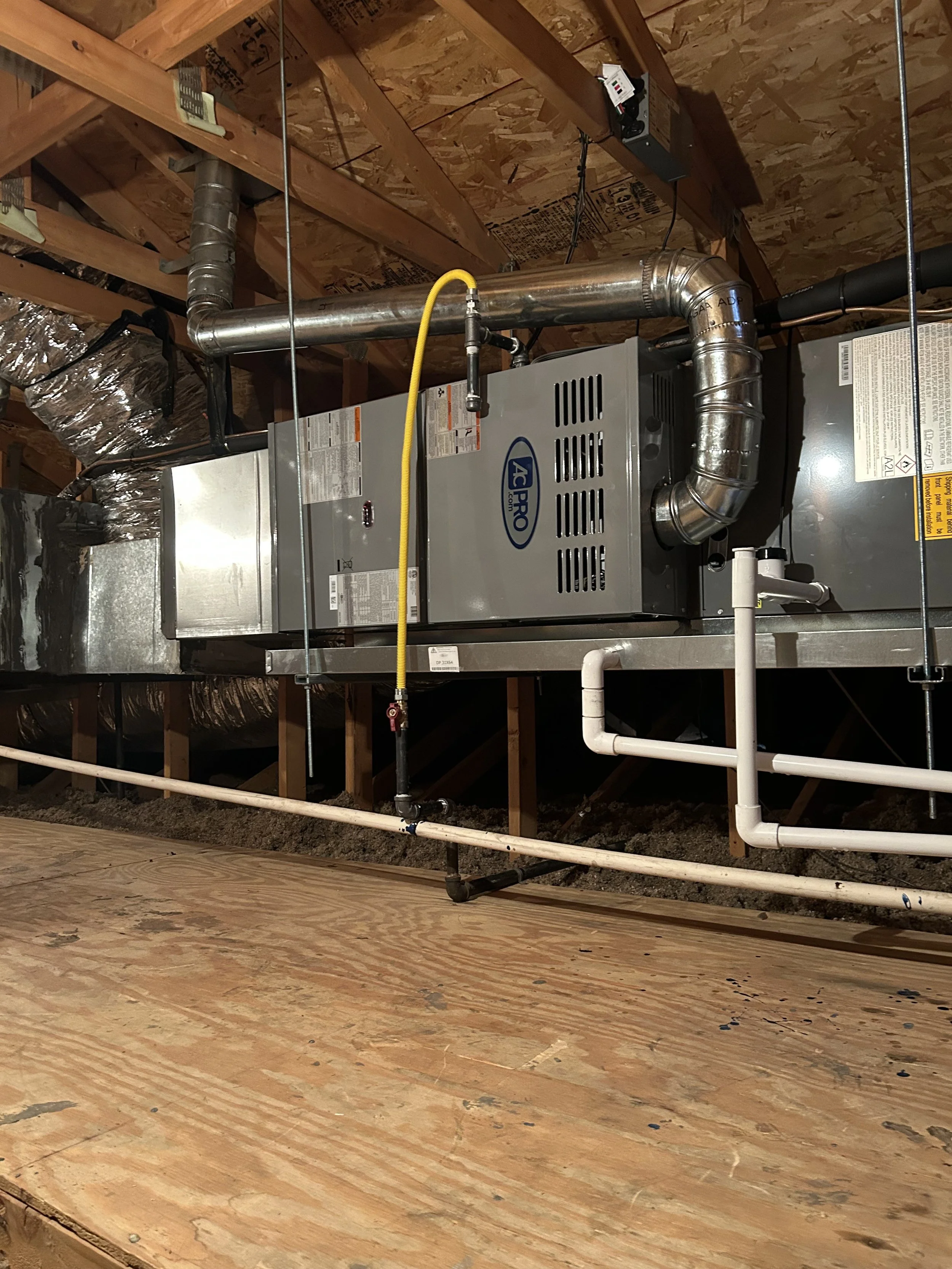 GAS ATTIC SPLITS THE AC PRO M SERIES HORIZONTAL 4 TON INCLUDES NEW DRAIN PAN, NEW SUPPLY PLENUMS, NEW GAS VALVES, NEW SAFETY SHUT OFF SWITCH, AND NEW INSULATED COPPER LINES.